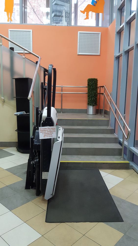 - Помещения библиотеки расположены на 1 и 2 этажах. На внутренней лестнице установлен стационарный лестничный подъемник наклонного хода.