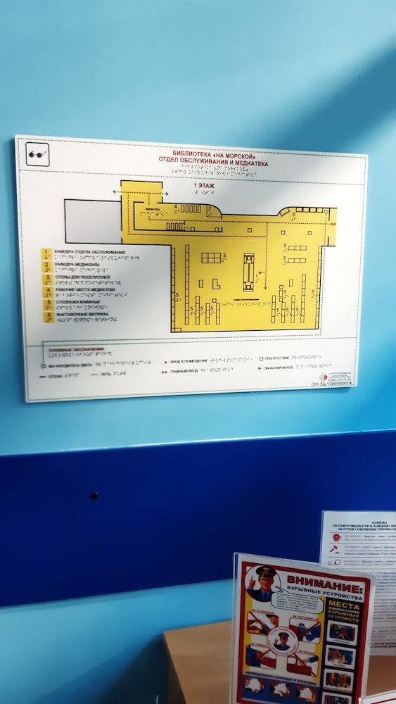 - Размещена мнемосхема движения по помещениям библиотеки и дополнительная мнемосхема движения по помещению отдела обслуживания и медиатеки. Размещены информационные пиктограммы с плоско-выпуклыми линиями и буквами и дублированием информации шрифтом Брайля.